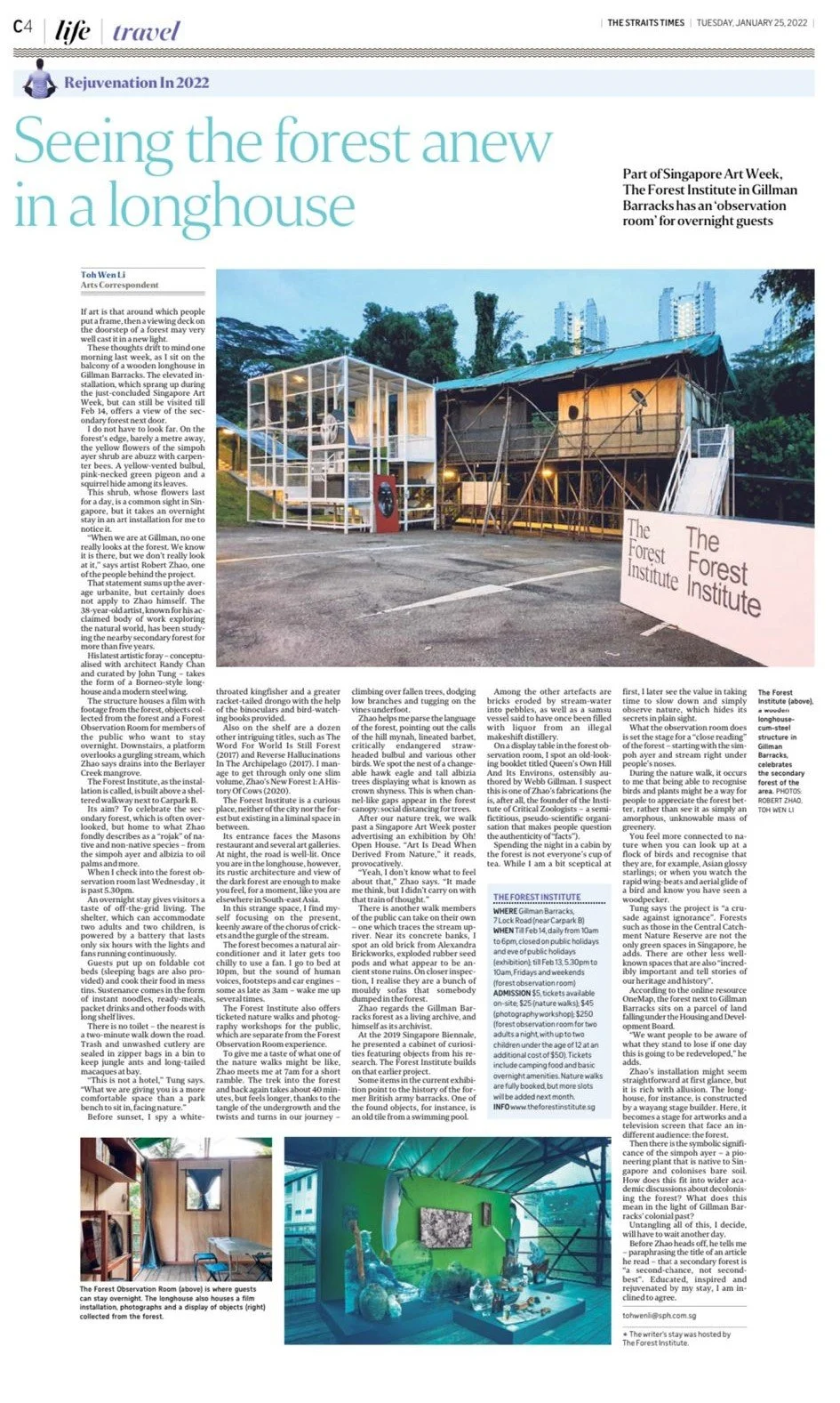 In conjunction with Singapore Art Week 2022, ░ The Forest Institute ░ is a large-scale architectural art installation housing a research installation, and comprising the Forest Observation Room and the River Platform, devoted to research on the secondary forest surrounding the Gillman Barracks precinct. Conceptualised by Robert Zhao & Randy Chan, and curated by John Tung, the Institute—that intervenes into existing pedestrian infrastructure—is accompanied by several large-scale prints of fauna installed in its vicinity, exposing visitors to the different realities of the area.